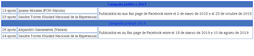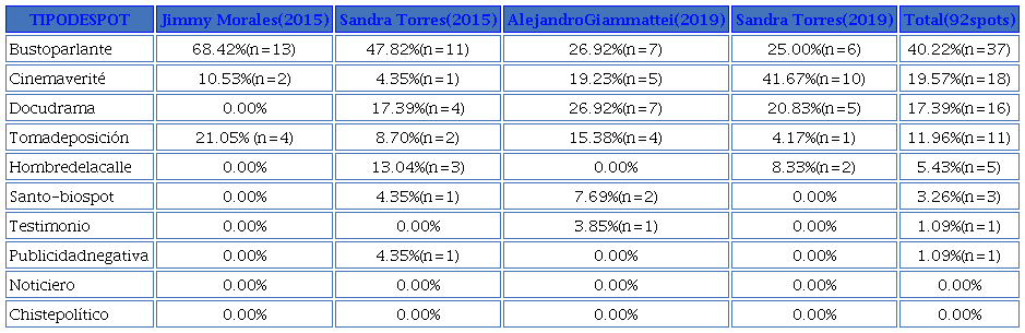 El tipo de anuncio más utilizado es el busto parlante. De los 92 anuncios analizados: el 42.2% (n=37) fueron busto parlante. Se observa una evolución de la campaña de 2015 a la del 2019, donde hubo más variedad de registros y una mayor sofisticación de los anuncios. En Estados Unidos, país en el que nacieron los spots, han seguido manteniendo importancia. Y presentan un rasgo peculiar: la publicidad negativa viene suponiendo el 70 y 80% de los spots (Rodríguez Andrés, 2022). Sorprendentemente, en las campañas electorales analizadas, solo Sandra Torres recurre la publicidad negativa, pero en un porcentaje muy bajo (4.35%) y solo en 2015.