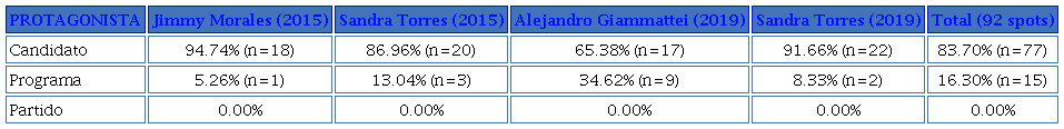 El protagonista de los spots es el candidato. Así, en el 83.70% (n= 77) de los 92 anuncios estudiados, los candidatos eran el centro destacado, en el 16.30% (n=15) el protagonista fue el programa y en ninguno de los anuncios fue el partido. Esto evidencia la ausencia de partidos como instituciones sólidas que únicamente sirven de trampolín para figuras que aspiran a la presidencia. También muestra el poco peso de las propuestas concretas o programas políticos que se exponen. Toda la elección gira en torno al candidato y es reflejo de la personificación de la política (Orejuela, 2013; Rebolledo, 2017).