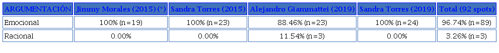 La argumentación es emotiva. Sólo el 3.26% (n=3) de anuncios de los 92 analizados presentaron argumentos lógico-racionales, el resto de los anuncios, 96.74% (n=89), fueron de argumento emotivo. Conviene destacar que esos tres spots fueron del conservador Alejandro Giammattei. Por tanto, se refuerza la idea de que estamos en la política de las emociones (Aira, 2020) o en la democracia sentimental (Arias Maldonado, 2016). Los spots buscan generar vínculos emocionales, conexión intuitiva, identificación, recuerdo… Hablan de sueños, esperanzas, optimismo, unidad, comunidad, trabajo, alegría, pero también de miedos, preocupaciones, amenazas, pesadillas, frustraciones, indignación.