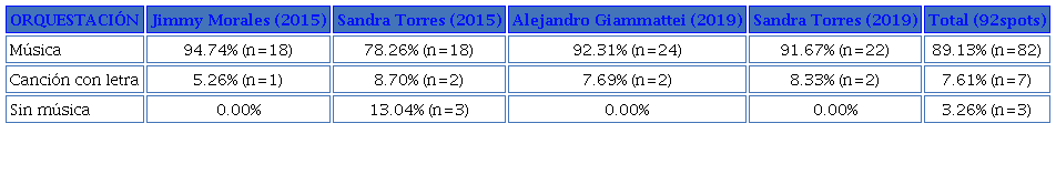 4. Orquestación, que sirve de contexto al resto de categorías, pero aporta el uso de un elemento que se identifica con la política de las emociones. Los spots usan la música, la imagen y el ritmo para transmitir ideas y contenidos. Por eso, la orquestación también es un punto importante en el análisis de anuncios electorales. Como señala Juárez, “el uso de música en los spots políticos a lo largo del mundo ha ido en aumento y es cada vez más difícil encontrar spots políticos que no tengan, al menos durante algunos segundos, la presencia de una tonada musical” (Juárez, 2007, p. 73).