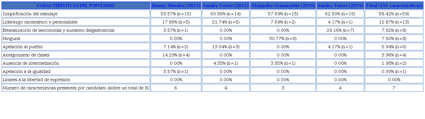 Abstract: Liberal democracy is currently experiencing a detachment from the citizenry, of which populism is a part, a phenomenon that is especially present in Latin American countries. However, the thesis that populism characterizes politics in Latin America still needs micro studies in specific countries. In this article, an operational definition of populism is offered, an analysis code is proposed that includes the main characteristics of this phenomenon and is applied to the spots of the candidates who reached the second and final round in the last two presidential elections of 2015 and 2019 in Guatemala. The results confirm the presence of populism in the spots, but the absence of some of the features leads to suggesting campaigns of mitigated populism. At the same time, not all candidates resort to it with the same intensity.