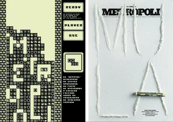 Con una cabecera que se integra constantemente en el contenido y una absoluta libertad gráfica de cada número, el planteamiento visual de las portadas busca adecuarse a las necesidades del mensaje y no está sujeto, por tanto, a ningún corsé estético, ni de concepto ni de información (IED Madrid, 2010); así, “una de sus notas distintivas es la modificación de la cabecera casi en cada número presentando creaciones gráficas relacionadas con el tema de portada y manejando múltiples estilos y metáforas visuales” (González-Díez y Pérez-Cuadrado, 2010, p. 151), con un lenguaje gráfico muy próximo al empleado por la cartelería. Sus portadas son, en definitiva, un ejemplo de diseño que forma parte indisoluble de la información y no se limita a hacerla legible, y que, a su vez, resulta de la profundidad de su enfoque, favorecido por la menor exigencia de inmediatez de su periodicidad semanal (Subiela-Hernández, 2017).