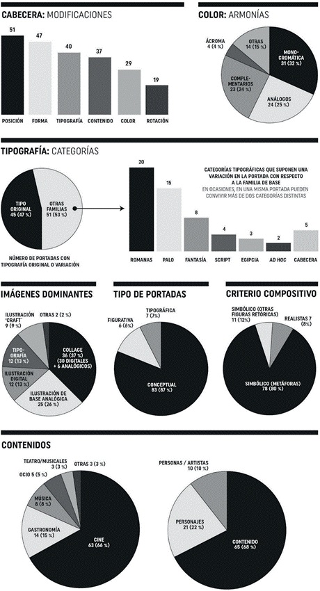 Existe una importante correlación entre contenido representado y el tipo de portada (V13), conforme a las categorías de Caldwell y Zappaterra (2014): se observan 83 portadas conceptuales, seis figurativas (siempre con ilustraciones) y siete de texto, si bien es preciso destacar el importante valor semántico o expresivo de la tipografía en estas últimas, siguiendo el análisis de Carrere (2009). Estos números coinciden, casi íntegramente, con el criterio compositivo (V14), según la clasificación de Tabuenca Bengoa et al. (2020): de la colección de 96 portadas, 89 utilizan una estrategia simbólica y tan solo siete recurren a propuestas realistas, todas ellas ilustraciones que representan a actores o actrices (de las películas Sicario y Destroyer), músicos (Bono y Rosalía), la citada cubierta de Almodóvar o las portadas para Dumbo y Bohemian Rhapsody, que se centran en los personajes.