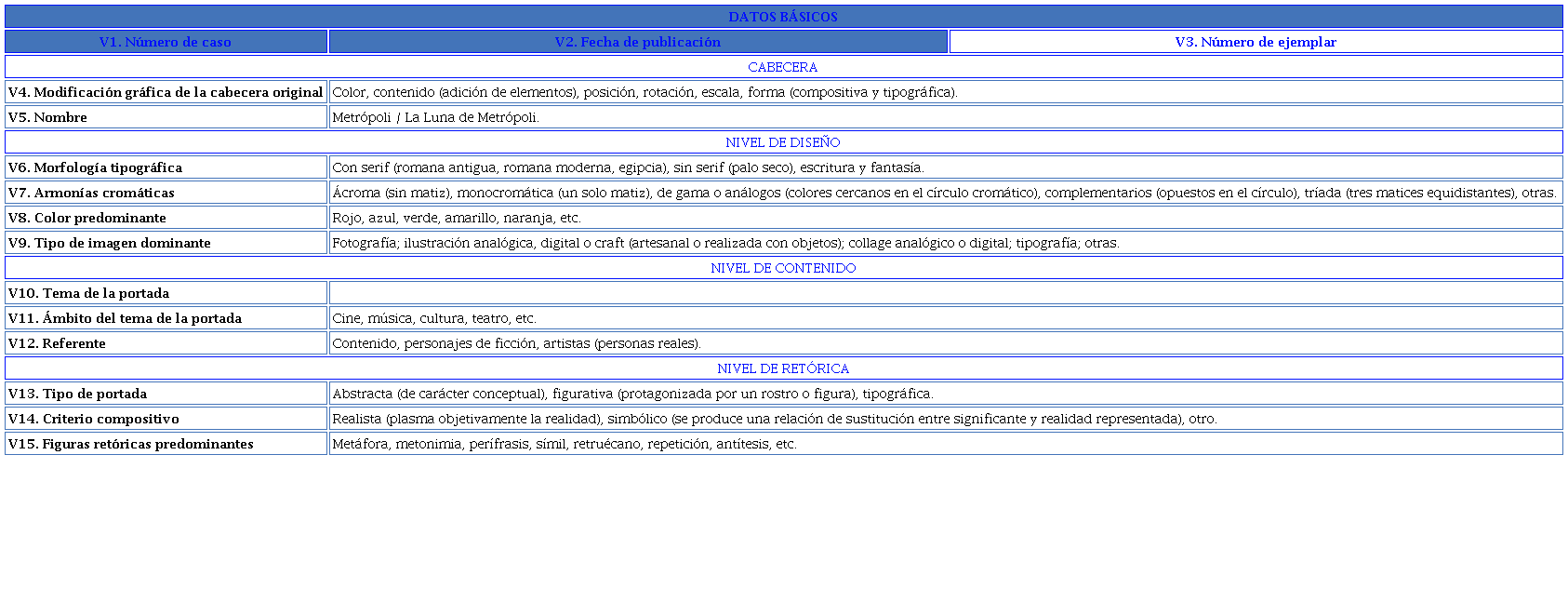 Sobre la metodología empleada, el análisis de contenido es una técnica que permite obtener indicadores objetivos en la descripción de los mensajes mediante procedimientos sistemáticos (Bardin, 2002) y que ha sido ampliamente utilizada en estudios previos sobre comunicación visual y diseño gráfico (Suárez-Carballo, Martín-Sanromán y Martins, 2021; Vicente-Fernández y Arroyo-Almaraz, 2021). En este estudio, se busca analizar tanto las variables manifiestas (presentes físicamente en las portadas, como los rasgos de la cabecera, los atributos plásticos y el contenido) como las variables latentes, aquellos “aspectos no observables directamente, por lo que deben ser inferidos a partir de uno o más indicadores manifiestos” (Igartua, 2006, p. 185) y que, en la presente investigación, apuntarían principalmente a las propiedades retóricas.