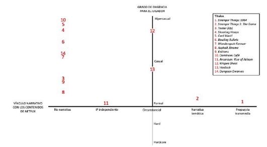 A pesar del lento crecimiento de la oferta de juegos por parte de Netflix, el contenido actual refleja algunos parámetros de interés sobre su lugar dentro de la estrategia de la compañía. El gráfico 1 explora y conecta dos variables concretas de la ficha de análisis en esta dirección. Por un lado, en el eje horizontal, el tipo de propuesta narrativa que proponen los videojuegos y su conexión (o no) con otro tipo de contenidos audiovisuales de diferentes IPs dentro de la plataforma. Por otro lado, en el eje vertical, el grado de exigencia del juego para situarlo en la órbita casual, tradicional o hardcore.