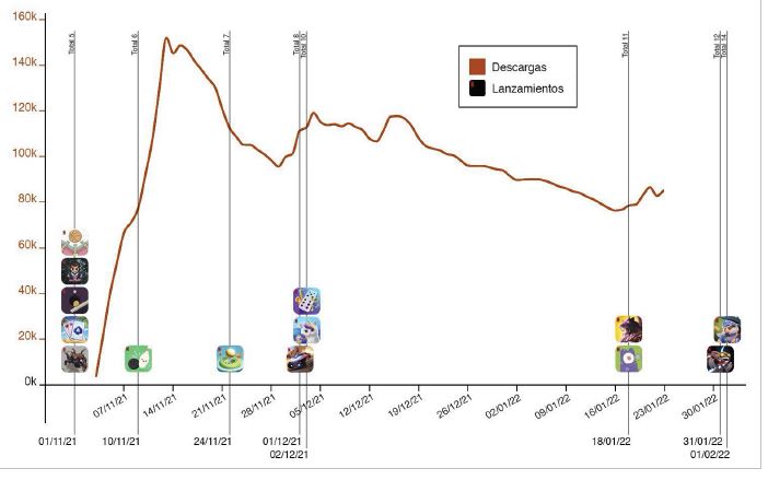 La evolución de estos datos refleja que, a pesar de los cuatro lanzamientos de diciembre (entre ellos, el popular Asphalt Xtreme), el ritmo de descargas de los juegos ofrecidos por Netflix se ha reducido en más de un tercio (de una estimación de 2,8 millones en noviembre a 1,8 millones en enero). Una tendencia que conviene contextualizar con un aspecto complementario. A partir de diciembre de 2021, una gran parte de las descargas están asociadas al lanzamiento de Asphalt Xtreme, el juego más descargado de Netflix, con una estimación que supera el millón y medio de descargas.