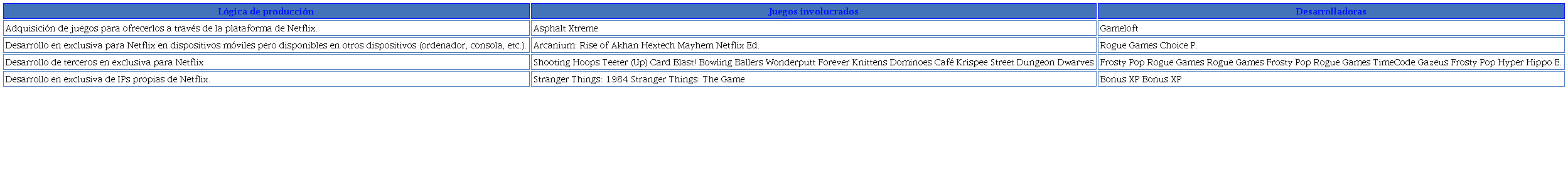 La incorporación de los juegos al catálogo de Netflix implica, de forma obvia, la exigencia de proveer nuevos contenidos de forma regular. A pesar del lento ritmo señalado en el epígrafe anterior, esta investigación se interesa por el origen de dichos contenidos y cuál está siendo la apuesta de Netflix en ese sentido. Por ello, se ha sintetizado en la tabla 2 la lógica de producción y la desarrolladora de la que proceden los 14 juegos que, por el momento, ofrece Netflix a sus suscriptores.