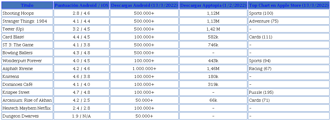 La limitación de los datos anteriores es la dificultad para medir, de forma rotunda, el éxito de la estrategia de un contenido a partir de las veces que este se ha descargado. Un escenario completo requeriría de un conjunto extra de datos, de los que sólo Netflix dispone, como la media de tiempo de uso de cada uno de estos juegos o su longevidad en los dispositivos móviles de los suscriptores de la plataforma.