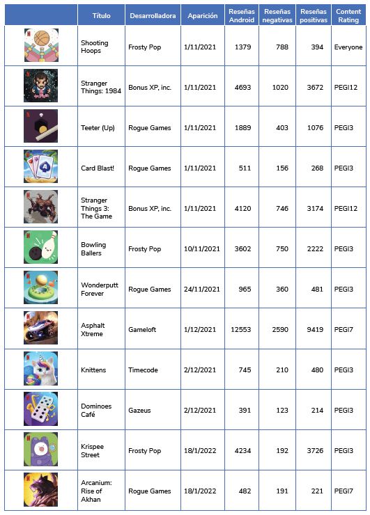 El número de reseñas de cada juego (tabla 1) refleja que los juegos más descargados no son siempre los más reseñados y/o comentados. Krispee Street, un juego de objetos ocultos, lanzado el 18 de enero de 2022, reúne un número de descargas discreto, pero presenta un coeficiente de aprobación (0,83) que es el más alto de todos los juegos de Netflix (seguido de Stranger Things: 1984 con 0,57 y Asphalt Xtreme con 0,54). Por otro lado, los juegos con menor adhesión por parte de los usuarios han sido Dungeon Dwarves (-0,59), Shooting Hoops (-0,29) y Hextech Nayhem Netflix Edition (-0,19).