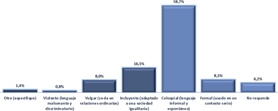 Cuando se analizan algunas de las preguntas que atienden las variables relacionadas con la competencia mediática se debe mencionar en primera instancia la dimensión que hace énfasis al lenguaje y en la que se indaga la manera en que los estudiantes califican el lenguaje que es utilizado por los youtubers que acostumbran a seguir (Figura 1). Un 58,7% lo cataloga de coloquial, seguido por un 16,5% que lo describe de incluyente. Sin embargo, un 8,3% de los encuestados lo cataloga como formal, mientras que un 8,0% vulgar. Un restante 6,2% no responde, un 1,4% define otros y un 0,8% de violento.