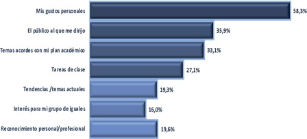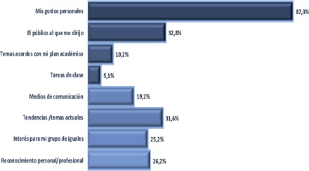La dimensión ideología y valores analizó los criterios que toman en consideración los estudiantes a la hora de seleccionar los contenidos que publica en las redes sociales YouTube e Instagram. Al analizar la red social YouTube los datos indican que un 58,3% de los estudiantes dijo que consideraba los temas acordes con sus gustos personales, el 35,9% pondera el público al que se dirige, el 33,1% los temas acordes con su plan académico, seguido por un 27,1% que dijo que era importante lo relacionado a las tareas de la clase. Un 19,6% optó por la alternativa reconocimiento personal/ profesional, el 19,3% tendencias / temas actuales y un 16,0% seleccionó los temas de interés para su grupo de iguales (Figura 9). En lo que respecta a los criterios que se toman en consideración a la hora de seleccionar contenido para publicar en la red social Instagram un 87,3% dijo que sus gustos personales es lo primordial. Mientras que un 32,8% considera el público al que se dirige, seguido por un 31,6% que toma en cuenta las tendencias / temas actuales. Un 26,2% considera el reconocimiento personal/profesional y el 25,2% lo relacionado al interés para su grupo de iguales. El 19,2% dice que los medios de comunicación, seguido de un 10,2% que considera aquello que esté acorde con su plan académico y el restante 5,1% lo afín con las tareas de clase (Figura 10).