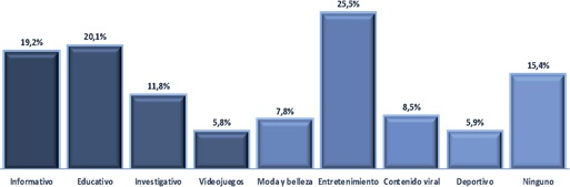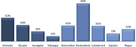 Estética es la última dimensión analizada en esta investigación y consideró el tipo de video que los estudiantes comparten en YouTube. Se destaca que el 25,5% lo hace con videos de entretenimiento, seguido por un 20,1% que lo hace con temas educativos. Un 19,2% comparte los videos informativos, el 15,4% ninguno, el 8,5% contenido viral, el 7,8% moda y belleza, un 5,9% a los deportivos y un 5,8% a los de videojuegos (Figura 11). Al indagar los datos con la red social Instagram, lo análisis estadísticos indican que el tipo de video que comparten con mayor frecuencia (34,9%) pertenece al de entretenimiento, seguido por un 21,5% informativo, un 14,9% con videos de contenido educativo, 14,3% de moda y belleza, un 14,1% contenido viral y 11,0% ninguno. Un restante 8,9% en investigativo, 7,0% cae en las categorías de deportivo y 4.5% en la de videojuegos (Figura 12).