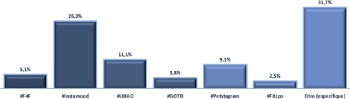 Analizando una de las preguntas dentro de esta misma dimensión se auscultó sobre los hashtags que más se utilizan en Instagram. El “hashtag” es un conjunto de caracteres precedido por el símbolo de numeral (#) que sirve para identificar un mensaje sobre un tema específico en las redes sociales (Oxford, 2022). Una mayoría de estos 31,7% dijo que preferían otros provistos en la encuesta. Sin embargo, un 26,3% dijo utilizar #Instamood, seguido por un 11,1% que optó por la alternativa #LMAO y un 9,1% por el conocido #Petstagram. Un 5,1% seleccionó la alternativa #F4F, un restante 3,8% y 2,5% respectivamente pertenecen a la categoría #GOTD y #Fitspo (Figura 2).