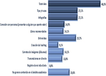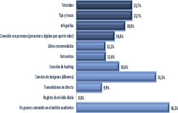 Al analizar la dimensión tecnología se indaga sobre los recursos que los estudiantes han utilizado para crear contenidos académicos en YouTube (Figura 3). Se aprecia que un 48,3% dijo utilizar los tutoriales, seguido por un 27,1% que dijo la infografía y otro tanto tips y trucos. Un 25,7% dijo haber utilizado las entrevistas y un 14,9% subraya que ha hecho conexión con personas (presentar a alguien que aporte valor). Sin embargo, un importante 14,1% seleccionó la opción libros recomendados, otro similar porcentaje (14,1%) carrete de imágenes, un 13,0% transmisiones en directo y un 9,1% creación de hashtag. Al analizar los recursos que han utilizado para crear contenidos académicos en Instagram (Figura 4) se aprecia que un 36,2% dijo no generar contenidos en el ámbito académico, el 31,1% utiliza carretes de imágenes (álbumes), el 21,7% los tutoriales, y otro tanto que dijo tips y trucos. El 19,0% dijo infografías, mientras que un 14,8% dijo conexión con personas (presentar a alguien que aporte valor). El 11,4% entrevistas, el 11,2% libros recomendados y el 9,9% seleccionó la opción transmisiones en directo.