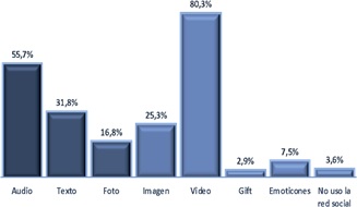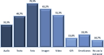 Al realizar los análisis para la dimensión procesos de interacción se auscultó sobre los elementos que utilizaban los estudiantes para interactuar en YouTube e Instagram. En el caso de YouTube el 80,3% de los estudiantes encuestados manifestaron usar el video como elemento para interactuar en YouTube, 55,7% el audio, el 31,8% texto, el 25,3% imágenes, el 16,8% las fotos, el 7,5% emoticones, el 3,6% no usa esta red social y el 2,9% el “gift” para interactuar (Figura 5). En lo que respecta a la red social Instagram el 70,5% de los encuestados interactúa con las fotos, el 61,2% usa las imágenes, el 51,3% los videos, el 49,7% utiliza el texto, el 35, 5% prefiere el audio, el 19,3% los emoticones, el 13,8% los conocidos “gift” y el 10,7% indicó no manejar el Instagram (Figura 6).