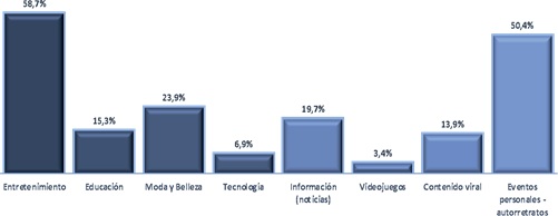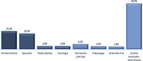 La dimensión procesos de producción y difusión ponderó el tipo de contenido que producen los estudiantes encuestados en YouTube e Instagram. En lo que respecta a YouTube un 58,7% establece que produce mayormente contenido de eventos personales autorretratos, seguido por un 23,1% que dijo hacerlo en asuntos de entretenimiento y un 19,7% para educación. Mientras, que un 6,2% para información noticiosa, un 3,9% produce contenido de tecnología y otro tanto similar lo hace en temas de moda y belleza. Un 3,4% lo hace para temas relacionados con videojuegos y el restante 2,9% enfatiza en el contenido viral (Figura 7). Al analizar el tipo de contenido que se produce en Instagram se observa que una mayoría de los encuestados (58,7%) dijo que se inclina por el desarrollo de material de entretenimiento, seguido por un 50,4% que lo dedica a eventos personales o autorretratos. Un 23,9% dijo que desarrolla material de moda y belleza, un 19,7% dijo que se inclina por el material de información de noticias. Un 15,3% dijo que produce material de educación, un 6,9% contenido tecnológico y un restante 3,4% contenido de videojuegos (Figura 8).