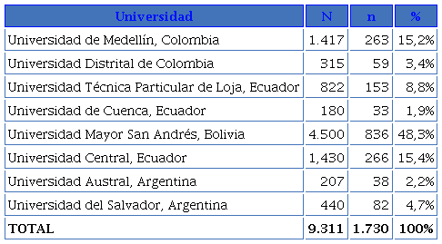 El tamaño de la muestra (n) que asciende a 1,730 estudiantes de un total de (N) 9,311 ha sido calculado utilizando la fórmula de tamaño muestral para proporciones, por ser una prevalencia el objetivo de estudio. Como parte del proceso se ha utilizado un 95% de confianza y un 2,126% de error. El muestreo utilizado es probabilístico, ya que se dispone de un marco muestral en cada universidad, por lo tanto, una vez asignados los tamaños a cada estrato, se seleccionan los elementos de la muestra haciendo uso de un método aleatorio, en este caso mediante la generación de números aleatorios. Sustentado en lo anterior la muestra del estudio quedó conformada según se presenta en la Tabla 1: