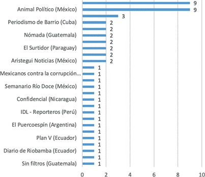 Entre los medios independientes que consideran más relevantes, se encuentran Animal Político de México y El Faro de El Salvador. Más allá de estos dos medios de comunicación de cariz independiente, que acumulan un total de nueve referencias entre los entrevistados, el estudio ha permitido identificar que el mapping resultante es muy diverso, aglutinando un total de 26 medios, pero sin que ninguno de ellos aglutine más de 3 referencias. A ello se une el desconocimiento de algunos entrevistados sobre este tipo de iniciativas periodísticas o la filosofía y componente fundacional de las mismas. Incluso, en el marco del trabajo, alguno de los entrevistados señaló medios generalistas. El Espectador de Colombia. La Figura 2, que aparece a continuación, presenta una visualización mediante colores de los 26 medios independientes señalados por los entrevistados, agrupados por bloques en función del número de menciones recibidas. Este resultado detalla aquellos medios independientes que conforman la actual coyuntura informativa del contexto latinoamericano y caribeño.