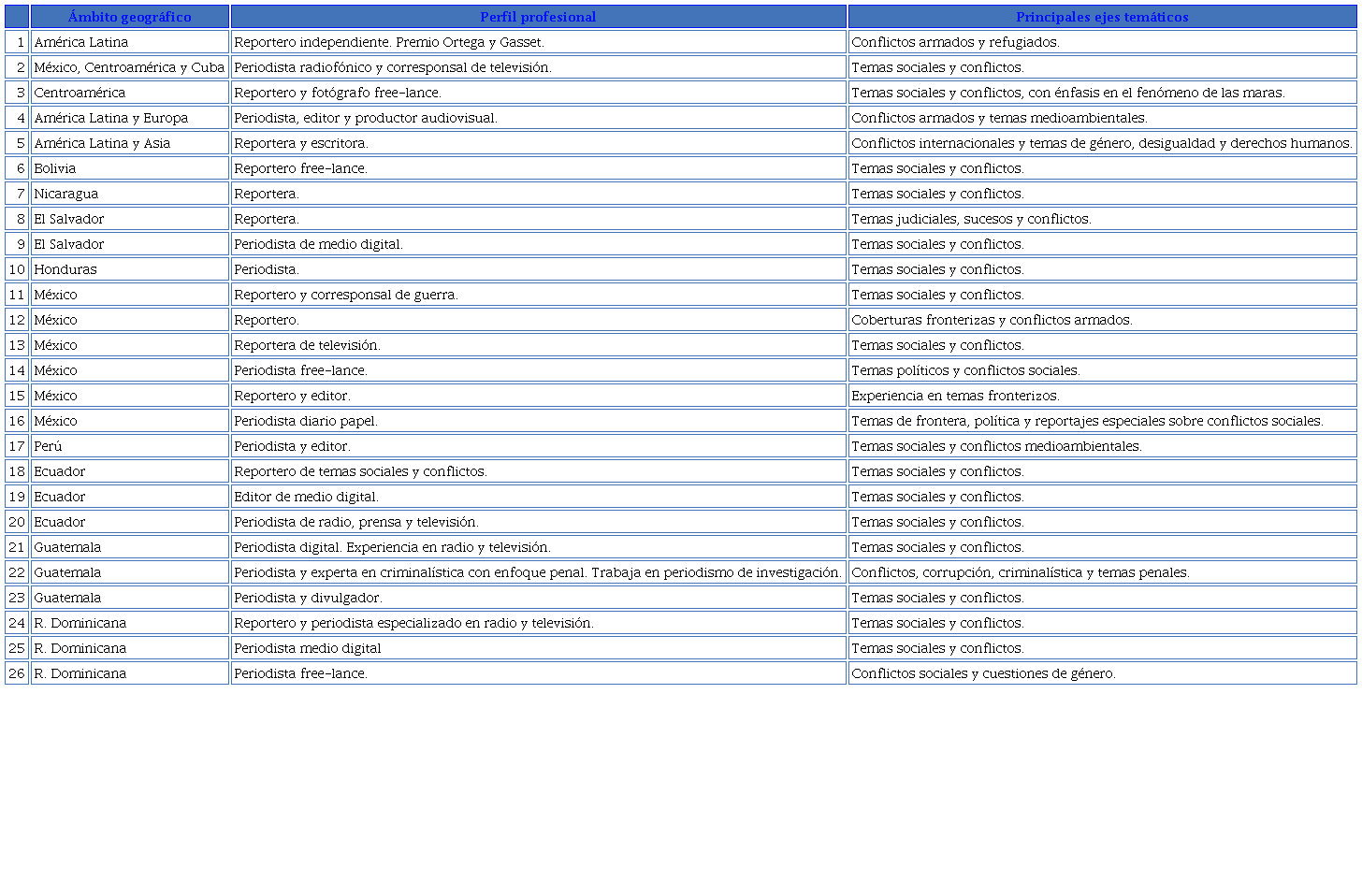 La muestra de entrevistados, de carácter no probabilístico, fue concebida como el conjunto de elementos de la población a los que se pide que participen en la investigación (Del Rincón, Arnal, Latorre y Sans, 1995). Los informantes invitados corresponden a un grupo de profesionales que trabajan como reporteros en contextos de violencia de América Latina y el Caribe (ver Tabla 1).
