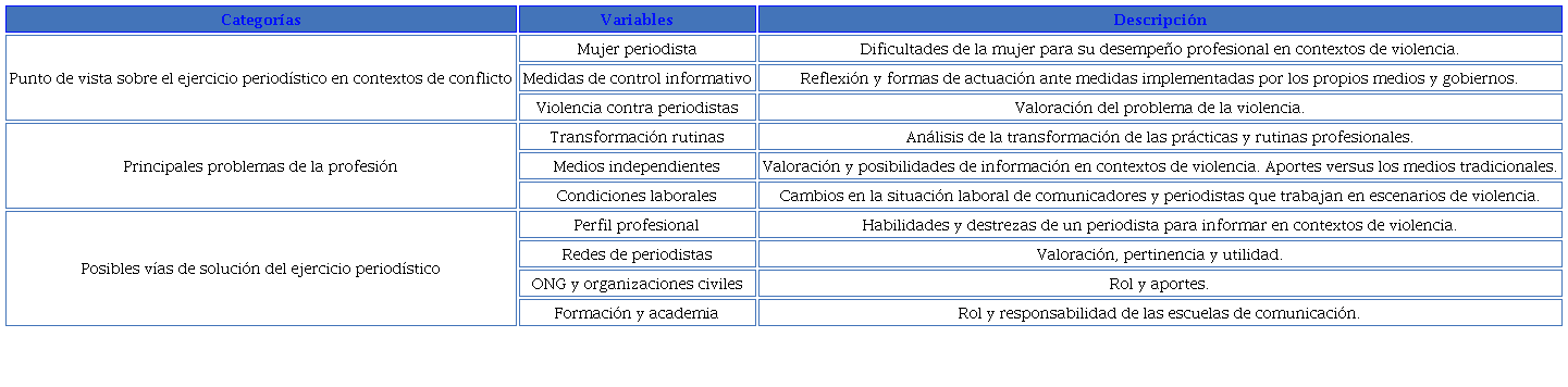 Las entrevistas se han diseñado a partir de un formulario de preguntas, tanto cerradas como abiertas, ideadas mayoritariamente para fomentar la reflexión de índole cualitativa. En total, se han obtenido diez variables temáticas, conformadas por 16 preguntas y agrupadas según 1) puntos de vista de los periodistas, 2) principales problemas y 3) posibles vías de solución del ejercicio periodístico en escenarios de conflicto en Latinoamérica.