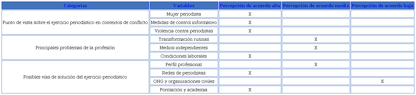 Las entrevistas en profundidad y los informes derivados del método Delphi han permitido compilar un conjunto de reflexiones inéditas de gran valor para la confección de un análisis diagnóstico y una aproximación descriptiva sobre las condiciones laborales y de seguridad de los periodistas en contextos de violencia en América Latina y el Caribe, por otro. Partiendo de las diez variables temáticas definidas, se ha construido y aplicado la siguiente tabla sobre el nivel de percepción de acuerdo (alto, medio o bajo) entre los 26 periodistas entrevistados (ver Tabla 3). Cabe mencionar en este apartado que para garantizar el anonimato por el tema tratado y se eviten repercusiones graves a los entrevistados, se los ha identificado con la numeración: periodista 1, periodista 2 y así de forma sucesiva.