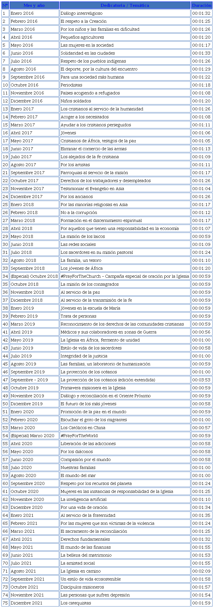 Finalmente, es destacable que de los 75 videomensajes analizados, 2 de ellos son especiales -es decir, no son mensajes mensuales como tal-. Se trata de dos campañas de oración por la Iglesia (octubre de 2018) y por el mundo (marzo de 2020), éste último mensaje en video en el que se pedía por el fin de la pandemia del coronavirus COVID-19.