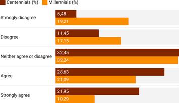 As a general rule, it has been found that centennials in both countries, without significant differences between the two nationalities, as well as in the ideological spectrum, feel more political efficacy than millennials when giving their opinion on social networks about the treatment that a film or series makes of something that makes them uncomfortable concerning social issues. That is, centennials seem to feel that their opinion is relevant to the change or modification of a plot, which would indicate a comparatively greater sense of self-efficacy or internal efficacy. In contrast, while not far from centennials in terms of political efficacy, millennials seem to agree markedly more than centennials that their personal opinion about a narrative should not go further than being an opinion.