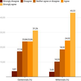 As a general rule, millennials and centennials in Spain and Mexico feel more effective in expressing their opinions on social networks concerning producers. Although, in both cases, the percentage of disagreement is lower, millennials are practically balanced in terms of acceptance of the usefulness of expression on social networks, but it is the centennials show a certain positive concordance in terms of this usefulness (Figure 2).