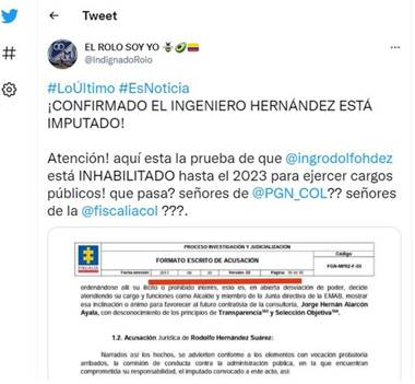 El ataque personal indirecto o circunstancial descalifica a una persona de las situaciones que la rodean. Tal es el caso de las declaraciones de los candidatos u otras personas que resaltan los problemas que han tenido en gestiones administrativas anteriores (Petro fue alcalde de Bogotá y Hernández, alcalde de Bucaramanga), como se puede apreciar en la Figura 7.