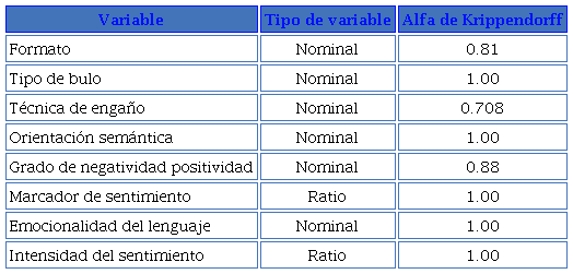 Una vez tuvimos definido el libro de códigos, llevamos a cabo varias pruebas entre los cuatro codificadores para validar el proceso de codificación y alcanzar el acuerdo deseado en el proceso; es decir, una buena fiabilidad inter-codificador. Los codificadores fueron los dos firmantes de este artículo, doctores en Comunicación, y dos estudiantes pertenecientes a un semillero de investigación en medios de comunicación entrenados durante varias semanas en la fundamentación teórica y en el proceso metodológico. Para garantizar la fiabilidad usamos el indicador alfa de Krippendorff, cuyos resultados obtenidos para cada variable se muestran en la Tabla 2. El valor del alfa de Krippendorff establece que si α es > 0.8 la fiabilidad entre los codificadores es buena; si 0.667 < α > 0.8, los resultados son considerados aptos para conclusiones tentativas, mientras que un alfa inferior es considerado inapropiado. Los resultados mostrados en la Tabla 2 proporcionan validez y confiabilidad entre los cuatro codificadores.