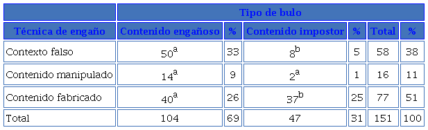 En cuanto a la variable tipo de falacia, debido a la diversidad de las categorías propuestas, el equipo decidió reportar la variable mediante al acuerdo obtenido por consenso para garantizar la fiabilidad. Para ello, cada una de las 152 unidades de análisis fue leída y clasificada en reuniones grupales en las cuales cada codificador seleccionó una opción. Se discutieron las diferentes opciones seleccionadas en las unidades de análisis en las cuales hubo divergencias hasta lograr un acuerdo. Todos los datos se recogieron en un archivo Excel y se procesaron con la versión 23 del programa SPSS, a través del cual se obtuvieron los estadísticos descriptivos (promedios -My desviación estándar -DT-) y se realizaron cruces de variables a las que se aplicó la prueba Ji-cuadrado de Pearson, utilizada para determinar si existen diferencias estadísticamente significativas entre las frecuencias esperada y observada en las categorías cruzadas y el coeficiente de contingencia, para determinar el grado de asociación existente entre éstas.