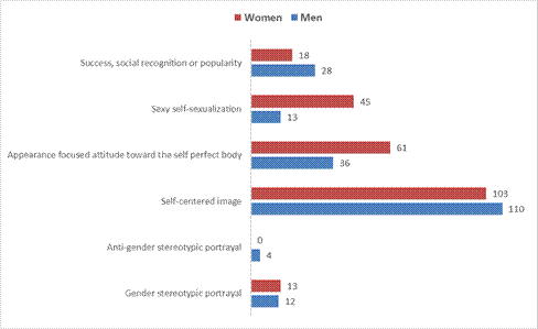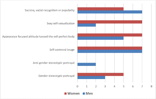In total terms, table 4 shows that of the top 14 influencers in Spain in the sample, 100% show photos with selfies (self-centered image), although some sometimes show photos in which other people, places or things appear; more than 85% have photos with appearance focused attitude toward the self perfect body and also more than 85% of the influencers show that they have success, social recognition, or popularity. On the other hand, more than 64% show sexy selfsexualization attitudes and more than 57% show a gender stereotypic portrayal.