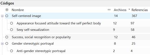 The codification process was realized with a qualitative deductive paradigm. We have coded the Spanish influencers’ photos according to the coding from the academic literature review (see table 2). In this table, we have compiled the nomenclature used by different researchers to name the three main categories related to the role of influencers and the sexualization of their public image. The subcategories relating to each of these three major categories are also listed.