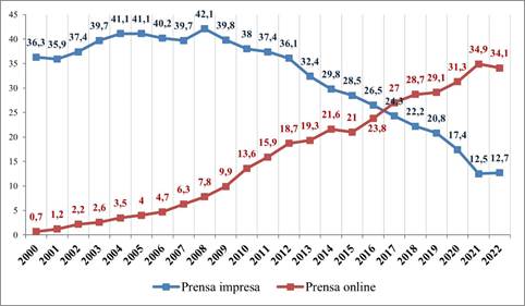 El gráfico, recogido con los datos del informe Marco General de Medios en España de 2023, de la AIMC, muestra como en el año 2017 se produjo el sorpasso de la prensa digital a la prensa impresa; por primera vez las cabeceras online obtuvieron más audiencia que las cabeceras en papel. A partir de esa fecha la tendencia ha sido similar; la prensa impresa cada día pierde más seguidores mientras que los ganan los periódicos digitales.
