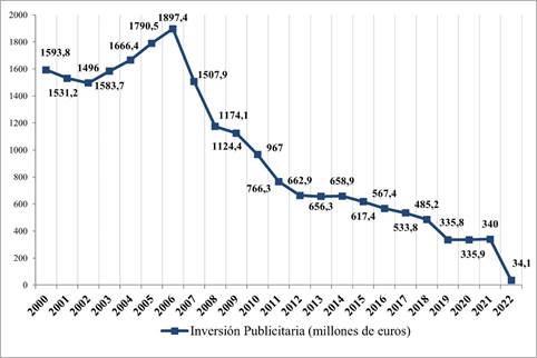 A pesar de su importancia, los datos del último informe de la empresa Infoadex presentado en febrero de 2023 reflejan una inversión de publicidad de 340 millones de euros en 2022, cifra que dista mucho de las de 2007, cuando la inversión en publicidad en los diarios rozaba los 1.894,4 millones de euros (Infoadex, 2022).