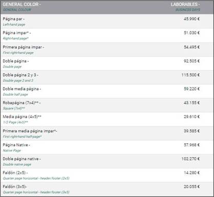 Para el cálculo de los importes a analizar se ha tomado como referencia el valor de la página en ubicación par, debido a que es uno de los formatos publicitarios más demandados y su emplazamiento no está condicionado a ningún precio y/o recargo especial.
