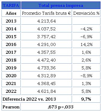 En los datos encontramos años, como es en el 2016, cuando el importe de esta tarifa sube un 14,2% con respecto al año anterior, frente a otros como el año 2020, cuando este precio disminuyó un 8,9%. A pesar de ello, la serie histórica muestra como en la última década los precios de tarifa de la prensa impresa han aumentado un 9,7% (Tabla 1). Estos datos se respaldan con los obtenidos con la prueba de Pearson, que reflejan una correlación significativa positiva entre los años y los precios de compra a tarifa de la prensa impresa (,673 p=,033).