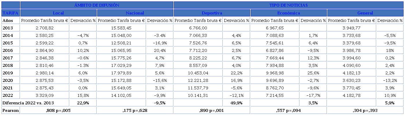 Además, sólo se ha tenido en cuenta las tarifas de los soportes en su edición general sin tener en cuenta las ediciones regionales ni las publicaciones “extra” y los “especiales”, ya que están condicionadas a la temática de ese momento. Para descubrir si había diferencias significativas entre ambas tipologías de soportes se realizó el coeficiente de correlación de Pearson con un nivel de significación para p=.05