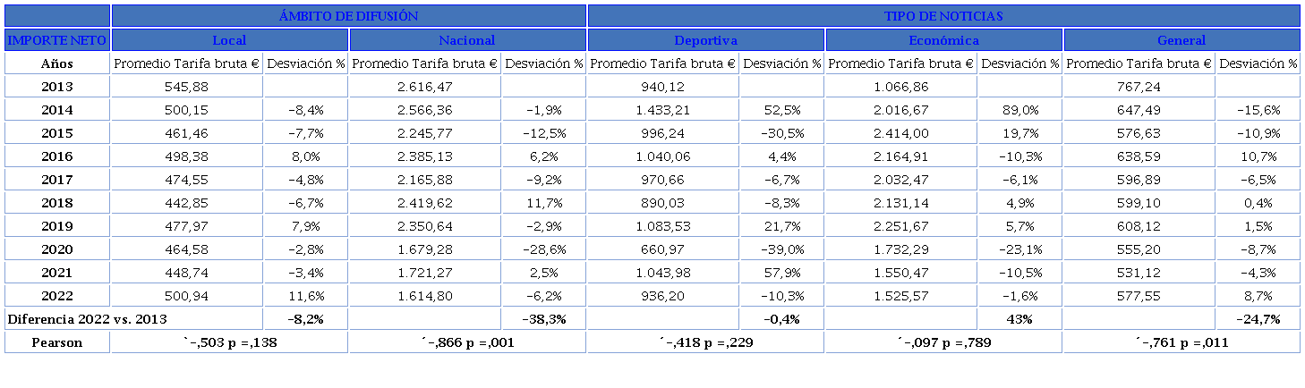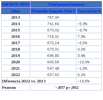 Respecto a los datos de tarifa neta del anuncio, es decir, el importe final que paga el anunciante por el espacio de la página par en un diario, muestra como realmente los precios de los anuncios publicitarios han disminuido un 19,5% en la última década (Tabla 3), datos que se corroboran con la prueba de Pearson, que refleja una correlación negativa significativa entre los años y el importe neto de compra del anuncio publicitario en prensa impresa (-,857, p=,002).