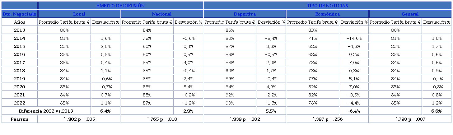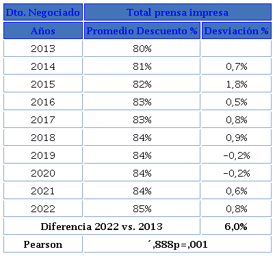 Los datos muestran cómo estas reducciones de precio han aumentado en la última década un 6,1%, siendo un avance constante en la década analizada. El descuento que recibe un anunciante por poner un anuncio de página par en un diario en el año 2022 es del 86,3%, mientras que en el año 2013 era del 81,3% (tabla 6). La correlación de Pearson refleja este aumento de los descuentos en la última década de manera significativa (,888, p=,001).