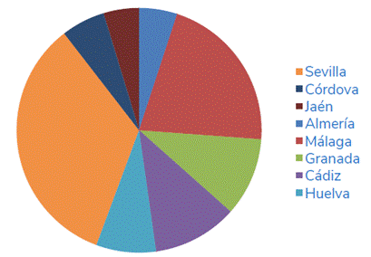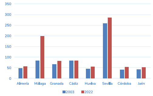 Este ligero descenso se debe, en gran medida, al incremento que experimenta la provincia de Málaga en los últimos 20 años. Actualmente, Málaga supone más del 23%, mientas que, en 2003, apenas representaba el 12,4%.