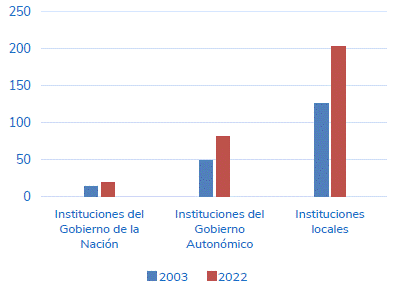 Muy significativo también es el caso de las universidades, que tanto en el 2003 como en 2022 cuentan con departamentos de comunicación en su totalidad. El cambio que se ha producido en estos últimos años es que, en algunas universidades, también organismos dependientes de la entidad educativa (institutos, fundaciones, etc.) disponen además de gabinetes de comunicación.