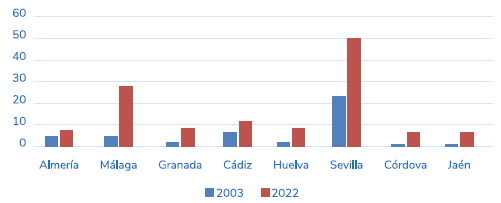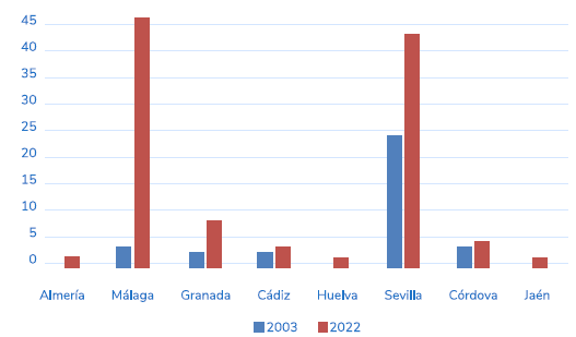 Tal y como muestra el gráfico 2, la provincia en la que más departamentos de comunicación existen en 2022 es Sevilla. También en el 2003 (véase figura 1) era esta la provincia que contaba con más gabinetes, por lo que se consolida como la capital de la comunicación organizacional, además de la capital política de Andalucía.