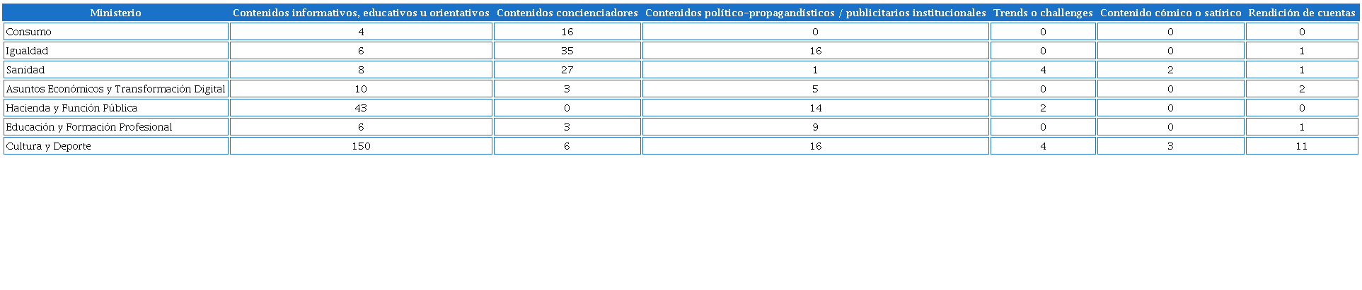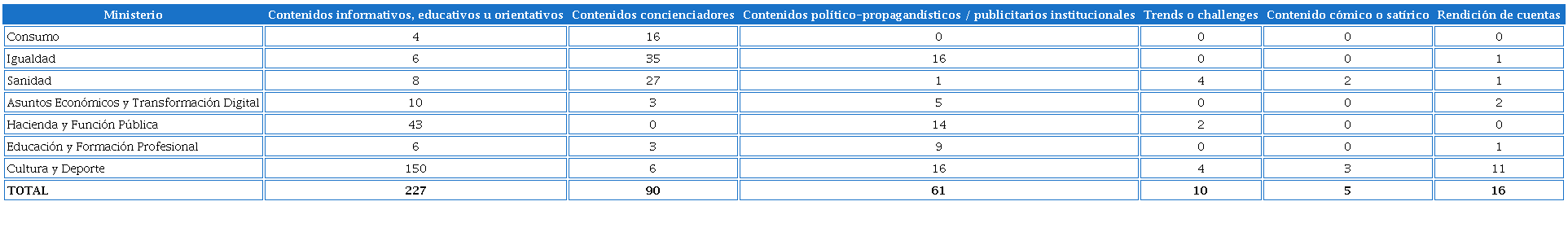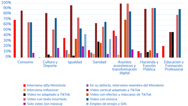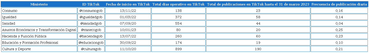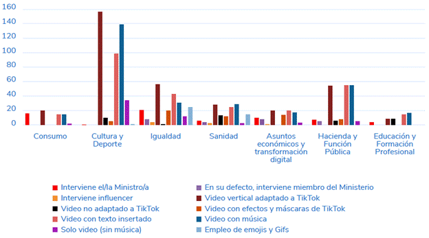 TikTok. La muestra de estudio se ha conformado por todas las publicaciones de dichos perfiles desde la primera publicación de cada perfil estudiado hasta el 31 de marzo de 2023 (primer trimestre de dicho año). En concreto, de las 22 carteras que componen el Gobierno de España hasta dicha fecha, solo 7 tenían presencia activa en TikTok. Dichos ministerios son: Igualdad, Consumo, Sanidad, Asuntos Económicos y Transformación Digital, Educación y Formación Profesional, Cultura y Deporte, y Hacienda y Función Pública. De estos perfiles se revisaron en total 414 contenidos, según el período establecido.