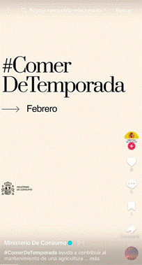 En relación con lo anterior, otra cuestión destacada tiene que ver con la difusión de campañas institucionales a través de los perfiles de los ministerios en TikTok. Además de lo ya señalado en el perfil del Ministerio de Sanidad relativo a medidas relacionadas con el COVID-19, se encuentran otros contenidos en este sentido. Es el caso de la publicación para prevenir el acoso escolar en el perfil del Ministerio de Educación o la campaña #comerdetemporada en el perfil del Ministerio de Consumo (Ver figuras 4 y 5).
