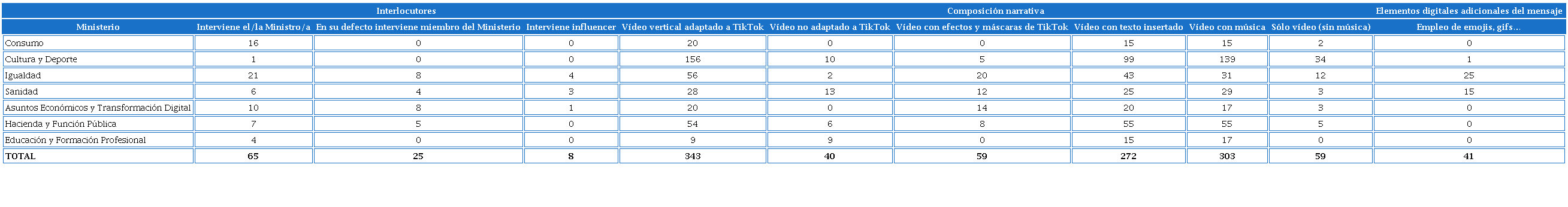 Por último, se ha revisado la configuración y estructura de los contenidos de los ministerios, tomando en consideración tres aspectos: si aparece algún interlocutor; cómo es la composición narrativa; y si se emplea algún elemento adicional al mensaje. Estos aspectos permiten verificar si los ministerios adaptan el mensaje a los formatos que el algoritmo de la red da prioridad y, con ello, si esto favorece el engagement de los contenidos y, por ende, su popularidad.