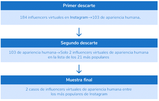 A la muestra de 103 influencers virtuales de apariencia humana se aplicó un segundo filtro por mayor popularidad usando la herramienta “most popular” que incorpora la web Virtual Humans, una herramienta que se basa en el número de seguidores para establecer cuáles son más populares: a mayor número de seguidores, más popular será considerado el influencer. Una vez aplicado el filtro “más populares”, que devolvió 21 perfiles, únicamente 2 tenían apariencia humana y, por tanto, cumplían con los requisitos previamente establecidos: tener apariencia humana y estar entre los 21 más populares. En la figura 1 se puede ver el proceso de selección.