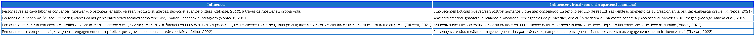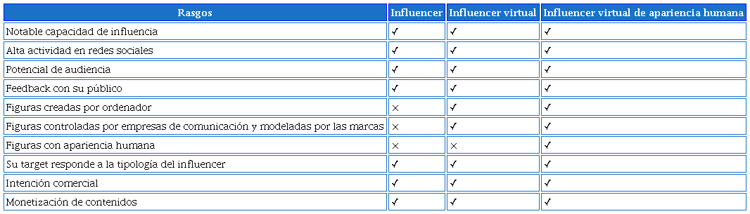 Como evolución de los influencers digitales emergen los llamados influencers virtuales. Por tanto, es posible diferenciar a los influencers digitales de los influencers virtuales (ver tabla 1). Los influencers virtuales surgen de la continua evolución de Internet, el desarrollo de la Inteligencia Artificial (IA) y de la búsqueda por parte de las marcas de nuevos formatos publicitarios.