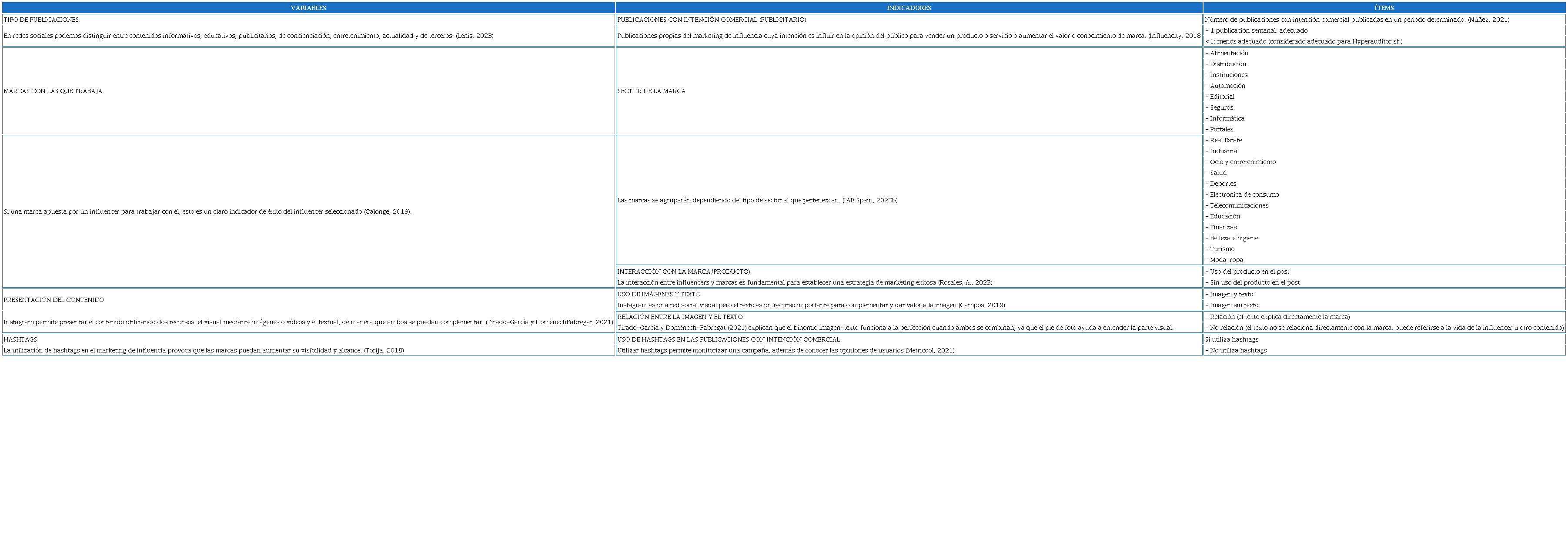 Como ya explicamos, este estudio incorpora una segunda parte de análisis, vinculada a los contenidos con fines comerciales y, para llevarla a cabo, hemos elaborado una segunda ficha de análisis atendiendo a una serie de indicadores e ítems que pueden estar presentes en los posts que se realizan para promover una marca por parte de los influencers (tabla 4).