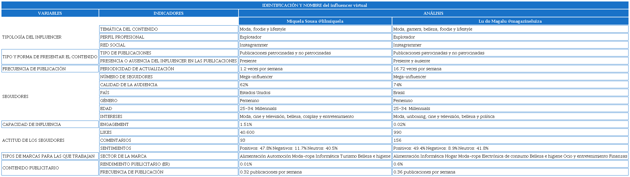En virtud de los resultados de la aplicación de la tabla 5, nos encontramos ante dos influencers virtuales instagrammers, Lil Miquela y Lu do Magalu, con un perfil profesional “explotador” o que promueven tendencias de última moda, y cuya temática es moda, lifestyle y foodies. Lu do Magalu además comparte contenidos sobre belleza y tipo gamers.